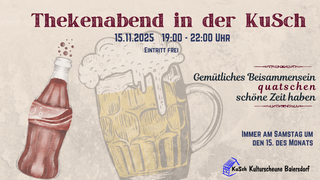 Beim Thekenabend wird die Kulturscheune zum Wohnzimmer: ungezwungen an der Theke stehen, am Tisch sitzen, ins Gespräch kommen, neue Leute kennenlernen oder einfach den Abend ausklingen lassen. Kein Programm, keine Hürde – Komm gern für eine Runde vorbei oder bleib länger.